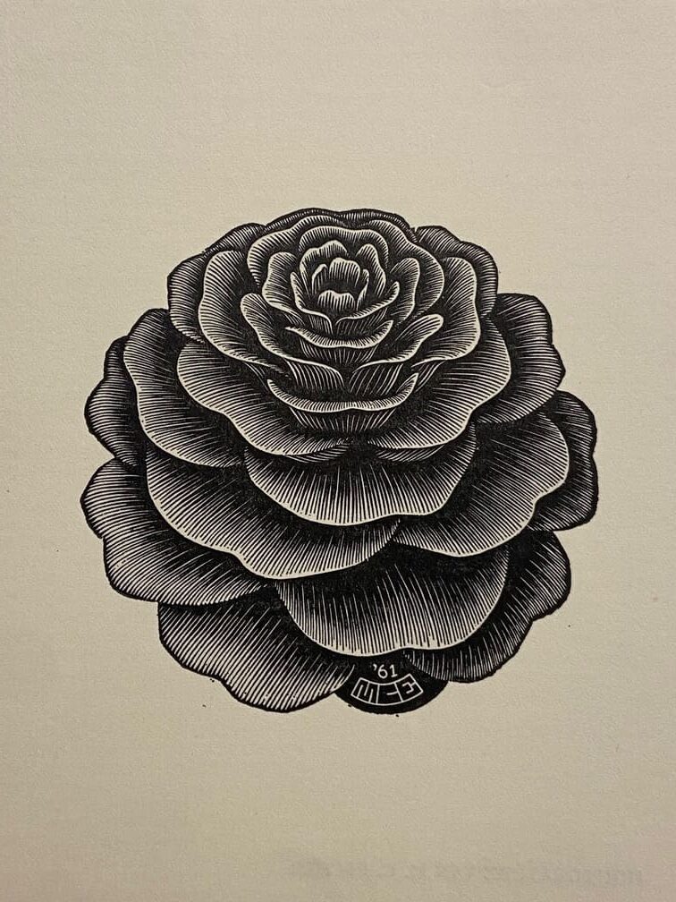 His earlier work mainly consists of landscapes, portraits, and a few still lifes. Later, his work evolves more towards the ‘Escherian’: regular divisions of the plane, playing with perspective, making the viewer struggle with three dimensions on a flat surface, cycles, metamorphoses, approaches to infinity, etc. In short, Escher manages to amaze the viewer, making us think. Not so much in search of something beautiful, but rather something astonishing. His works are each little gems, carefully recorded chronologically. This list can be found in the reference work by Bool, Kist, Locher, and Wierda: ‘Life and Work of M.C. Escher’. Often, reference is made to this reference work with the letter ‘B’ from Bool.